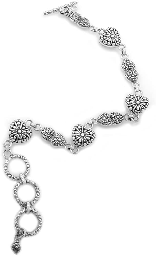 This intricate Sarda toggle bracelet is sure to attract compliments! Crafted from genuine 92.5% sterling silver, this jewelry has been lovingly crafted by our team of Balinese silversmiths, then oxidized and polished for a rich dimensional look. This bracelet links 8 heart-shaped filigree charms together. Four single hearts alternate with four double hearts. Delicate filigree on heart with subtle floral pattern. The toggle buckle is textured for added interest. The bracelet is adjustable from 7-1/2" to 8-1/2" and fits wrist sizes 6-1/2" to 7-1/2". The heart pattern is a beautiful reminder of your love. Treat yourself or the special woman in your life.